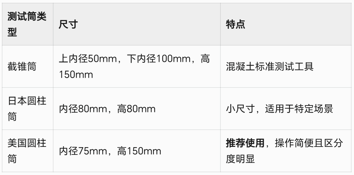 不同測試筒類型和尺寸會(huì)影響流動(dòng)度結(jié)果,常見類型包括: